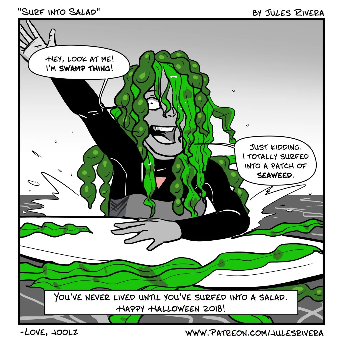 Bloop! And in 2019 that was the start of my syndication career. A year later, I would get asked to try out for Mark Trail. It's nice and kind of bizarre that this is where my cartooning career took off. Because I fell into a pile of seaweed while surfing.