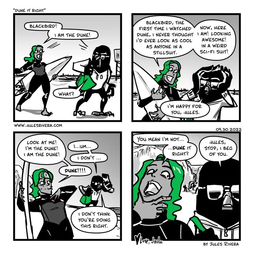 I’m not saying I started surfing because of Dune, but the wetsuits are certainly a selling point. Also, why don’t they surf on sand in Dune? That’s a thing. Way to leave money on the table.
