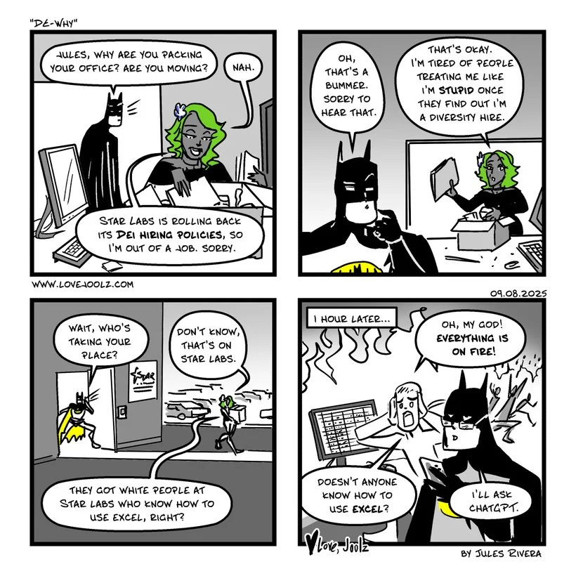 This is why I’ve got mixed feelings about the current fash’s destruction of DEI programs. DEI programs do help POC get out of poverty. I can't deny that. But DEI programs are kind of a shitty bandaid solution to the problem of White-run companies not hiring people of color. If all your leadership is all white, any POC employees are never going to be respected. Not really. DEI hires are meant to give the image of a diverse workplace. Not actual integration or unity. Just the same ol’ brown people doing the grunt work while the white higher ups reap all the profits and credit.